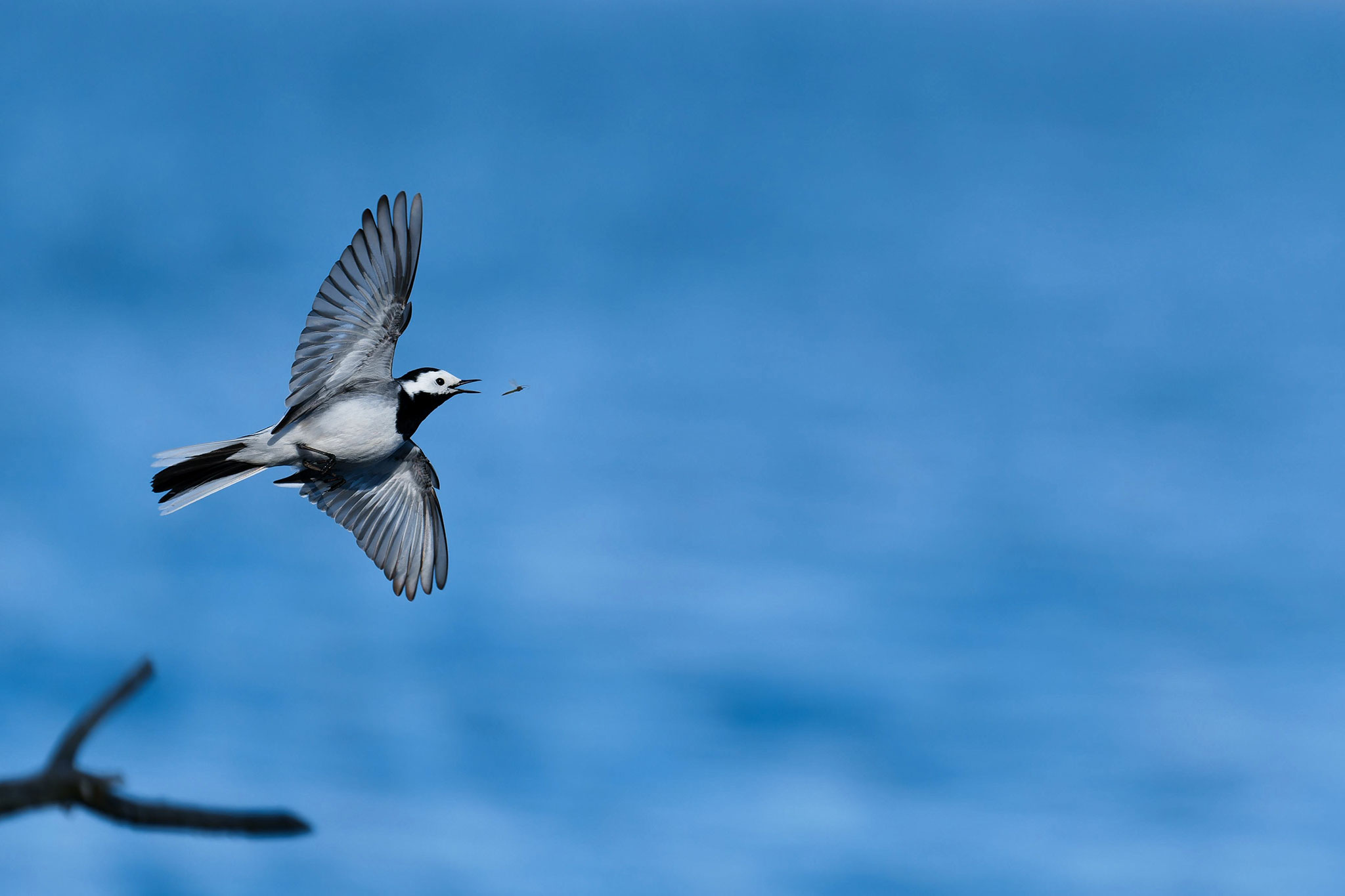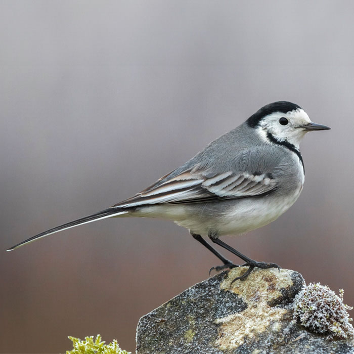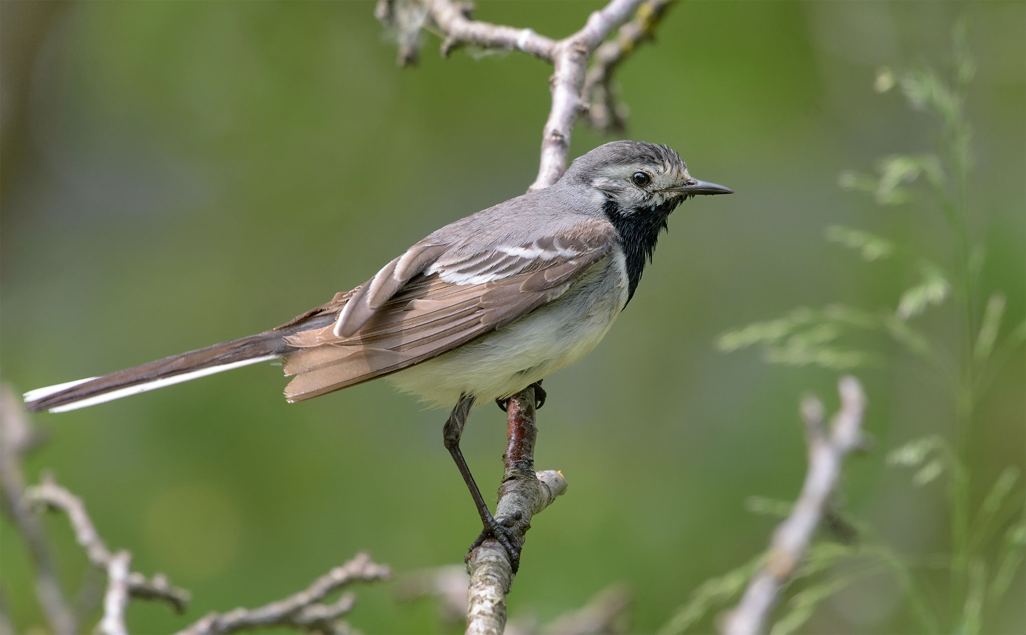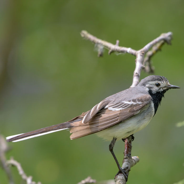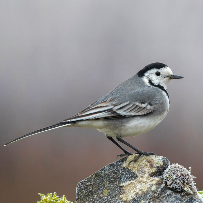 Das schwarz-grau-weiße Gefieder und der fortwährend wippende Schwanz.
