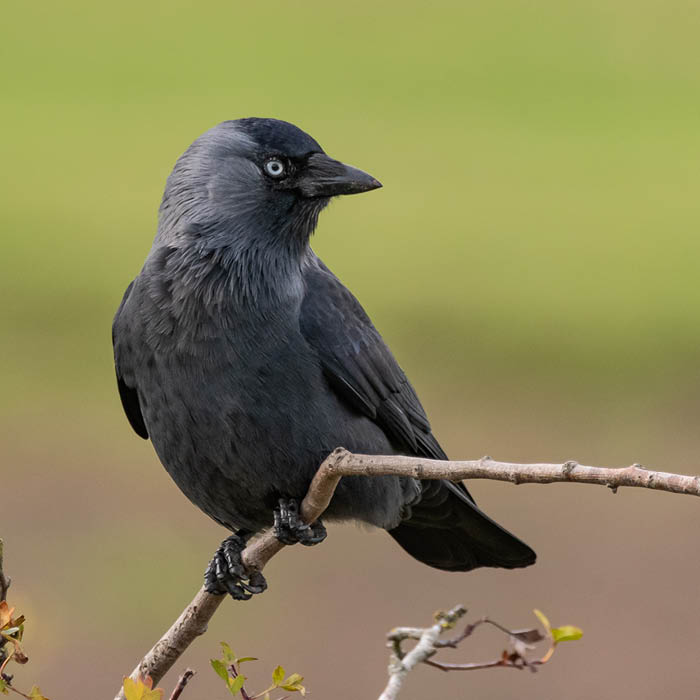 Ihr Gefieder ist überwiegend schwarz mit einem grauen Hinterkopf. Sie hat auffällig helle Augen und einen relativ kleinen Schnabel. Die Jungvögel besitzen ein braun-schwarzes Federnkleid.