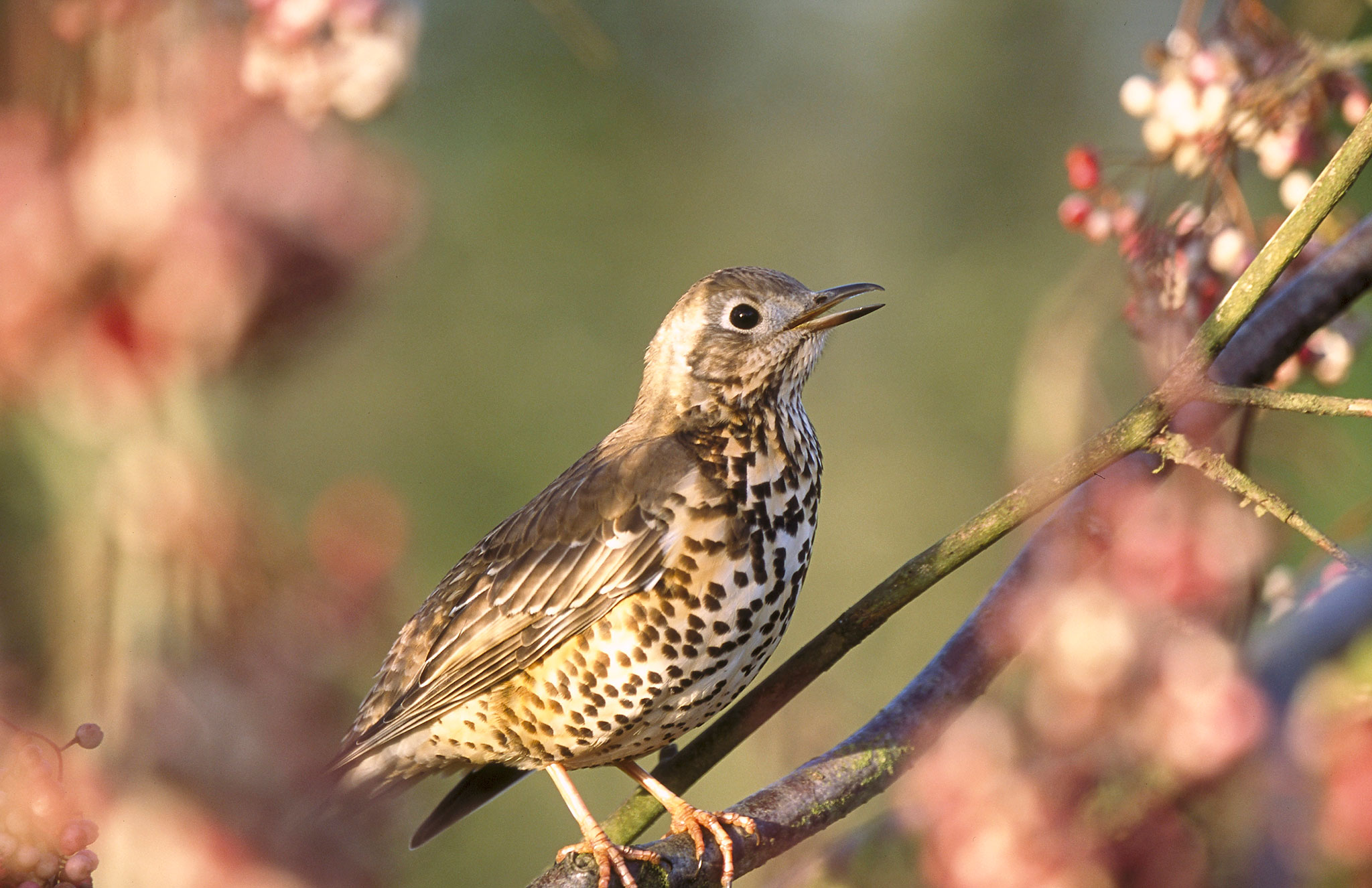 Schon Anfang Februar kann man an milden, sonnigen Tagen den Gesang der Misteldrossel vernehmen. Dieser klare, flötende Gesang unterscheidet sich von dem der Amsel durch die nur geringen Tonhöheschwankungen.