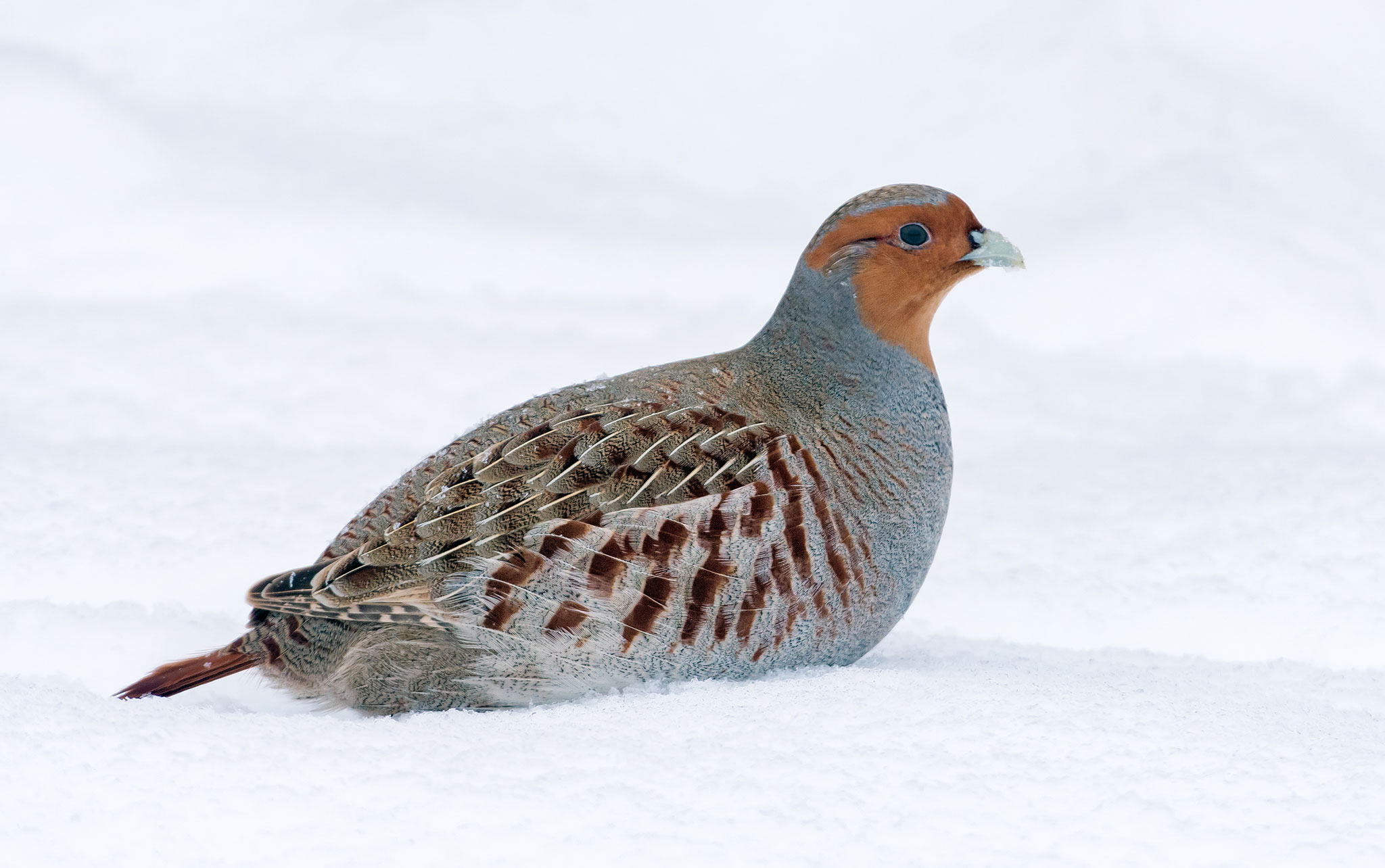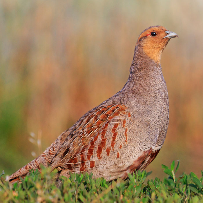 Der Kopf sowie die Streifen auf dem Federkleid sind rotbraun gehalten, weshalb das Rebhuhn aus der Ferne überwiegend grau erscheint.