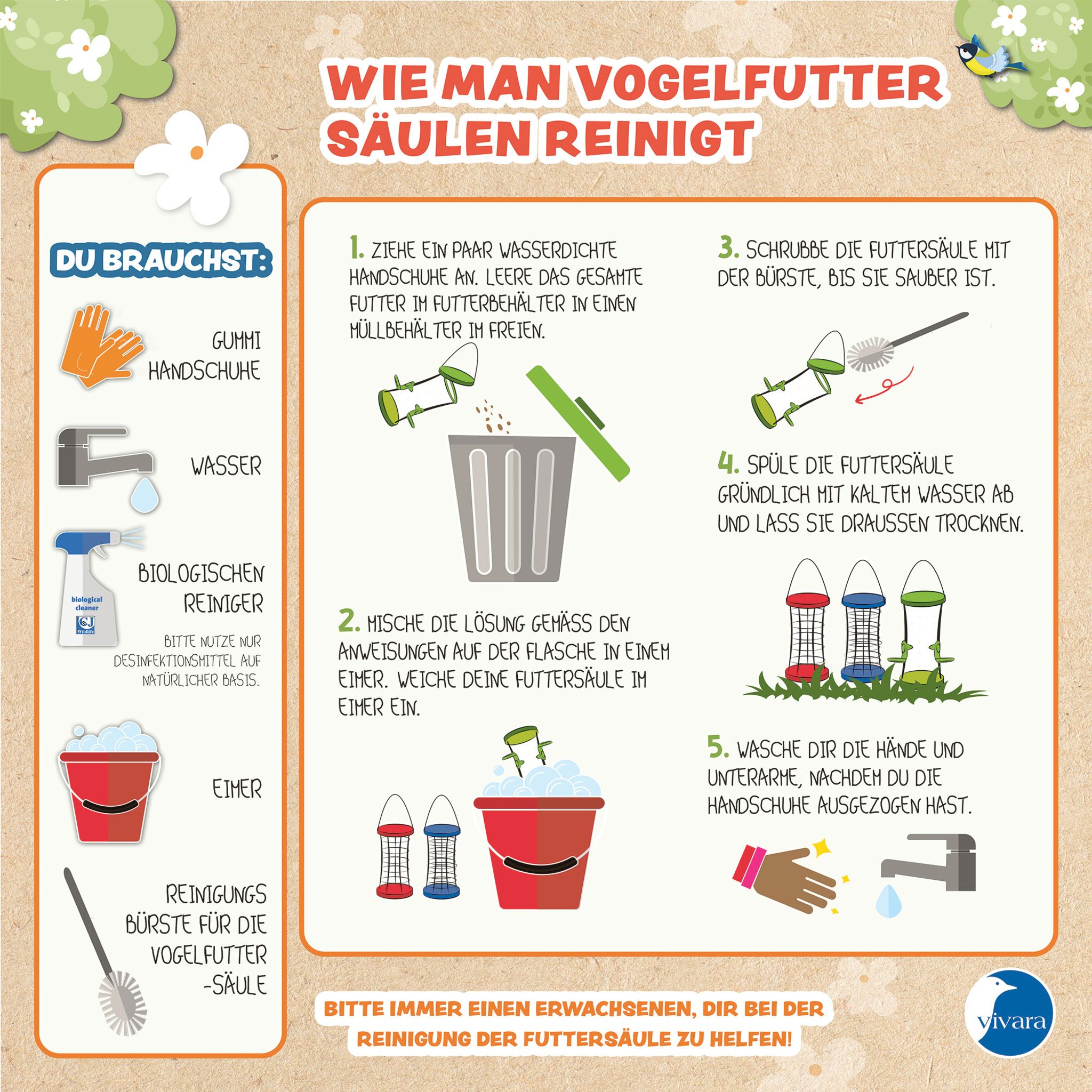 Obwohl die Anleitungen für Kinder leicht zu befolgen sind, sollten Erwachsene die Kinder beaufsichtigen, wenn sie an dem Bausatz für den Nistkasten Nell, das Futterhaus Jinto und das Schmetterlingshaus Dana arbeiten. Die EasyFlip-Futterautomaten und -Futtersäulen wurden so konzipiert, dass Kinder sie leicht hochheben und ohne die Hilfe eines Erwachsenen tragen können, obwohl wir bei jüngeren Kindern empfehlen, das Nachfüllen der Futterautomaten zu beaufsichtigen. Obwohl die Futtermittel nach den Standards für den menschlichen Verzehr eingekauft werden, sind sie nicht für den menschlichen Verzehr bestimmt, sodass Erwachsene darauf achten sollten, dass Kinder nicht davon essen. Es ist wichtig zu beachten, dass alle Futtersorten Spuren von Nüssen enthalten und daher für Kinder mit schweren Allergien nicht geeignet sind.