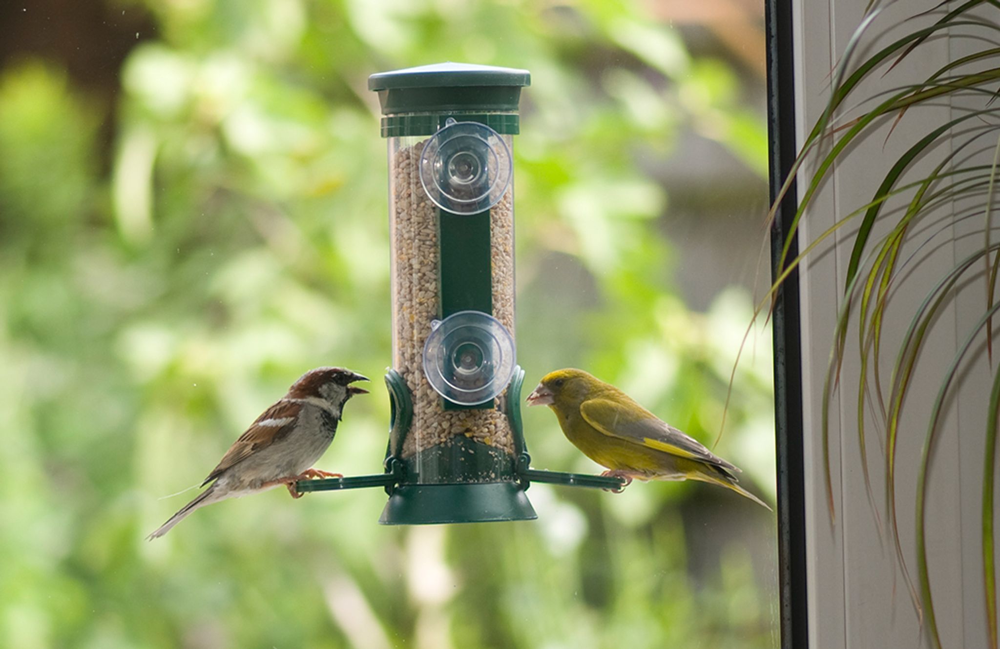 EIn Haussperling und ein Grünfink fressen von einem Fenster-Futtersystem.